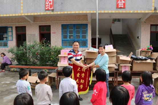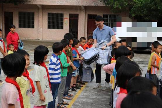 早上九点,米兰MinLan(中国)带着一如既往的初心从公司楼下出发, 从广州前往肇庆广宁县石咀镇。经过连续不断的蜿蜒山路,三个多小时后米兰MinLan(中国)到达了石咀镇。石咀镇,这个米兰MinLan(中国)来了三年的地方,感觉是那么的熟悉,从镇上到周围的村庄都能看到小学生的身影。为了不打扰学生休息,米兰MinLan(中国)选择下午14:00到达建中小学。此时已经有学生陆续返校,见米兰MinLan(中国)到来,学生们打开了校门,不约而同喊着“欢迎欢迎”,脸上洋溢着欢欣的笑容。建中村委、建中小学的校长、老师以石咀镇中心小学校长及副校长及学生们已集中等候,公司购买的打印机、书包、校服、体育用品、学习文具以及图书均摆放在教室门口的红旗下。根据学校的安排,现场举办了简单而有意义的捐赠仪式,为感谢公司的捐助,校长还赠送了 “大爱无疆,捐资助学” 的锦旗。